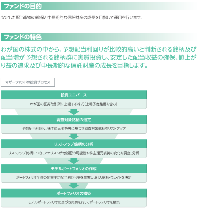 高配当株をスクリーニングして銘柄を決めて投資するというプロセスをまとめてファンド側でやってもらえるイメージで、配当株が気になっている方にはいいのかなという印象です。