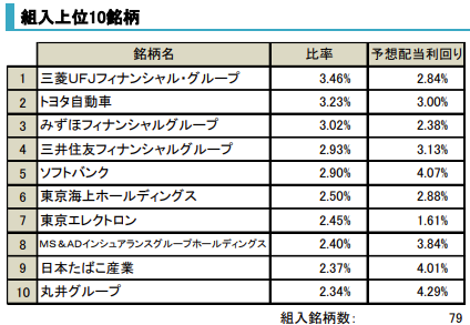 組み入れ上位を見ると、基本的には高配当に該当しますがこれって高配当なの?という会社も含まれています。先ほどの概要説明で触れている、配当増が予想される銘柄がこれに該当するのかなと思います。