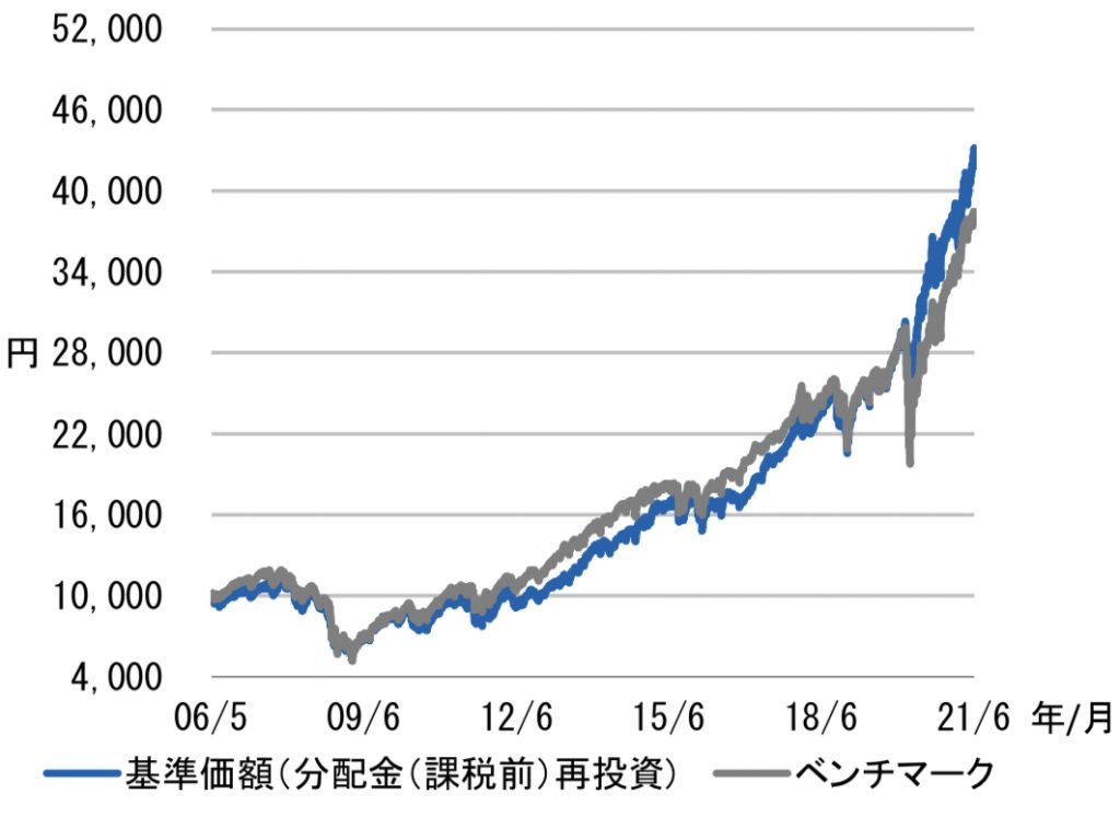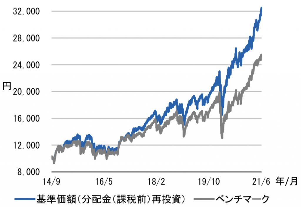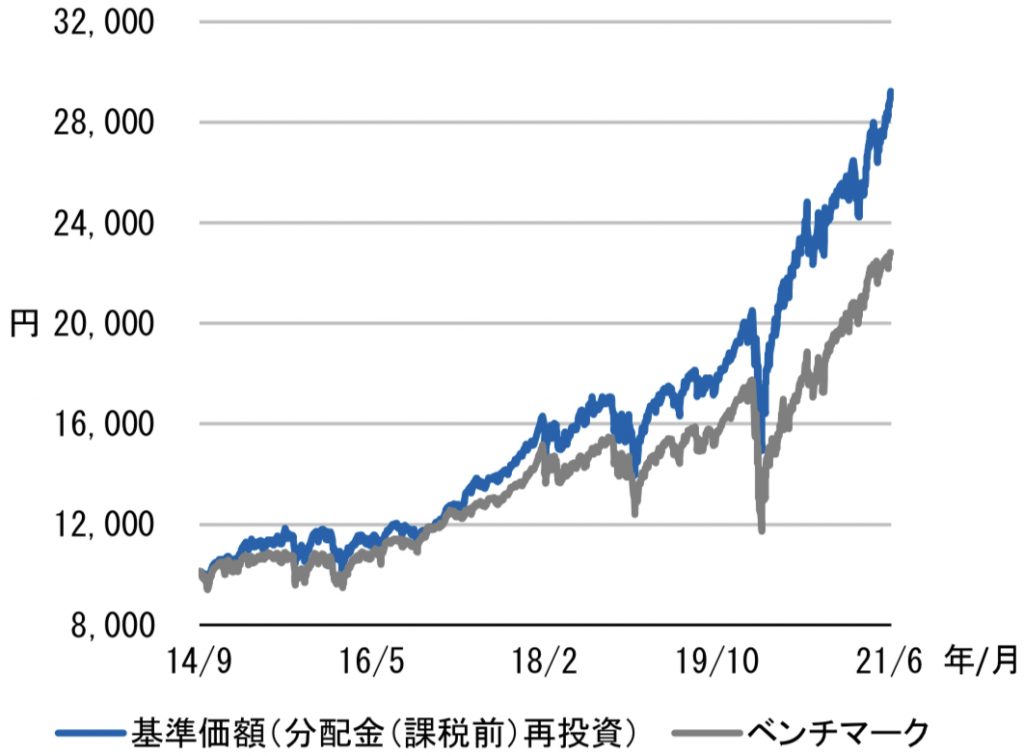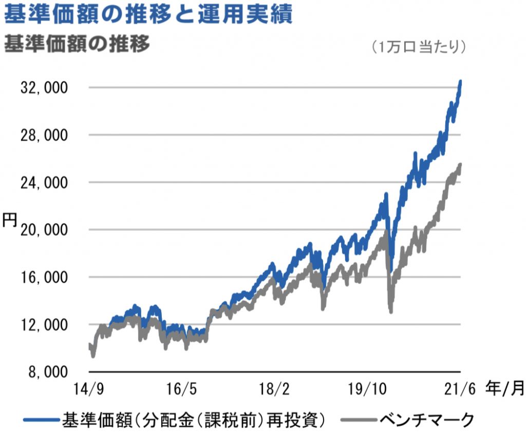 上のチャートはDコースのチャートですが、これを見てすぐにベンチマークよりも基準価額(再投資)が大きく上回っているのがわかりますよね。このファンドのベンチマークはS&P500です。多くの方が手数料が安いETF(インデックス)で運用してきたと思いますが、今回のケースの場合、高い手数料を払ってでもこのファンドへ投資しておいた方が良かったということになります。