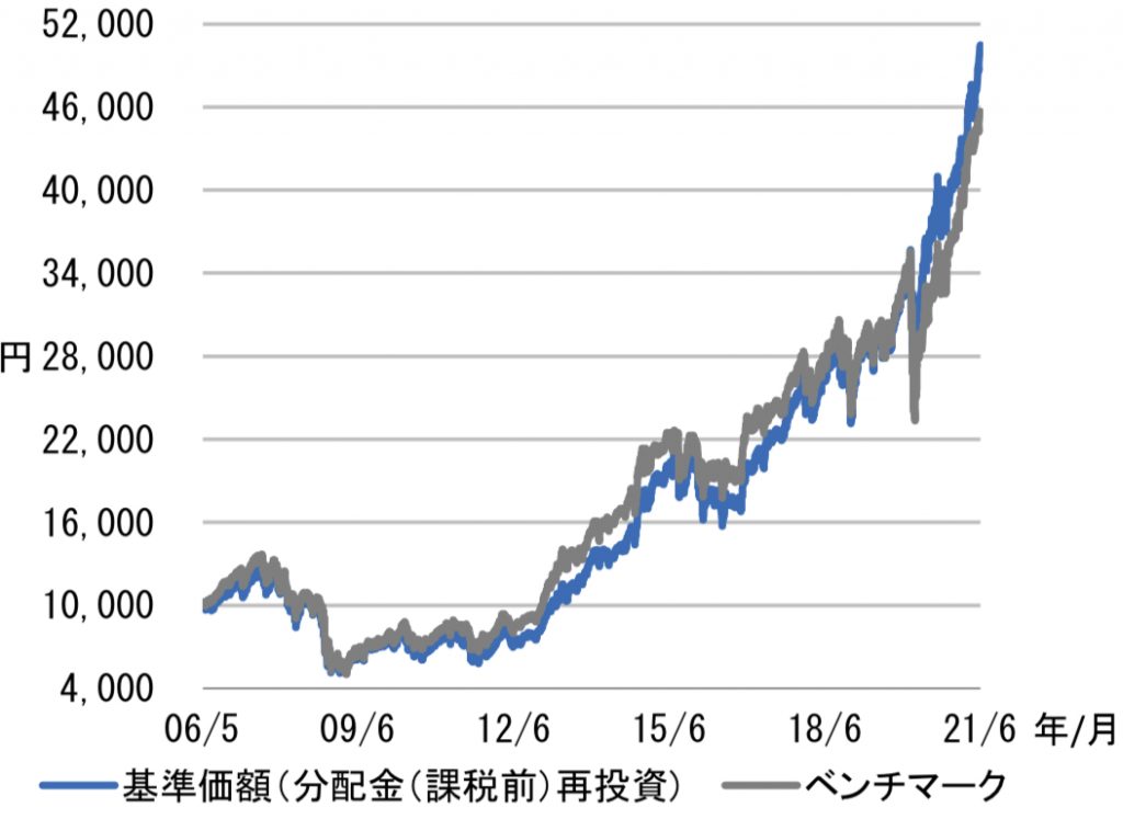 運用成績を見る上ではチャートを見るのが一番わかりやすいですね。前回のグロソブの解説の通り、分配金再投資の基準価額がポイントは「ベンチマーク」よりも上回っているかどうか?です。