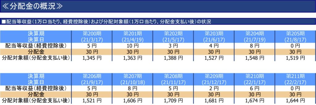REITの利回りは株式のようにファンドの基準価格だけで判断できません。基準価額の上昇+分配金(金利)で考えるのが通常です。基準価格の上昇率は直近1年で+32.5%、3年で+45.7%。毎年の分配金は1万口当たり、30円になります。