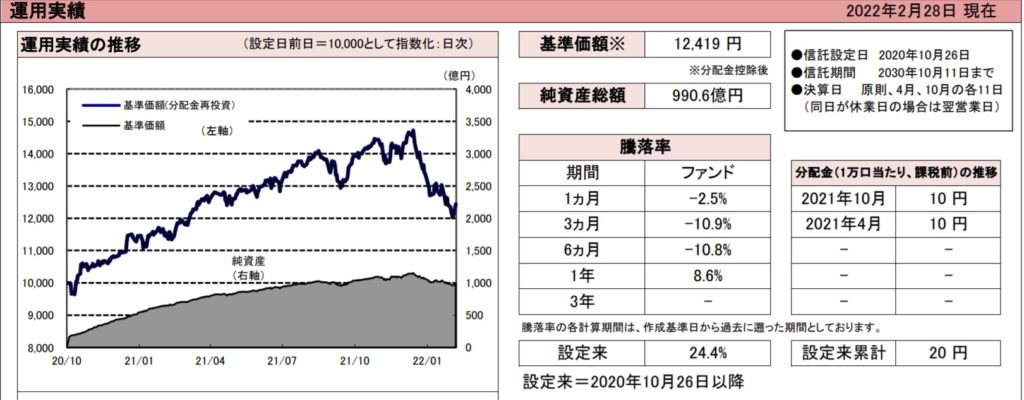 設定は2020年10月になりますので、まだ新しいファンドになります。設定来+24.4%、この1年では+8.6%のプラスになります。これまで分配金は1万口当たり、年2回1回あたり10円出ていますがこちらは今後も継続するか不明です。また、こちらの投資信託は為替ヘッジあり分配金あり「Aコース」かなし(Bコース)を選択できます。(記事中で取り上げているのはBコースになります)