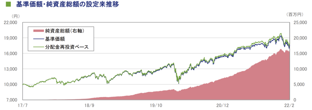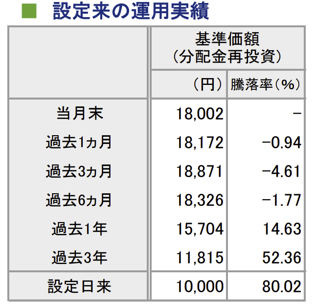 この1年では+14.63%、3年では+52.36%のプラスになります。またこちらの投資信託は分配金が出ます。金額はマチマチですが上昇傾向です。注意事項として、この運用実績は分配金再投資をした場合のリターンになります。