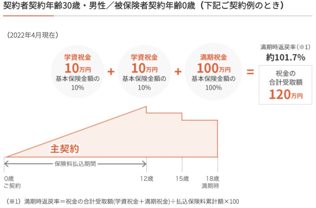 22歳満期だと保険期間が長いので返戻率は高くなりますが、一番お金のかかる大学進学の時にあまり受け取れないと教育資金準備の意味がないので、18歳満期を選ぶのが一般的です。もう一つの注意点としては17歳満期がないということです。祝金や満期祝金は受け取れる年齢後の契約日に受け取れるので、お子さんの誕生日と契約日によっては進学後に祝金を受け取る場合があるので気を付けてください。
