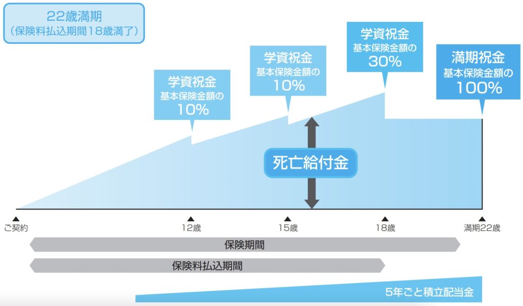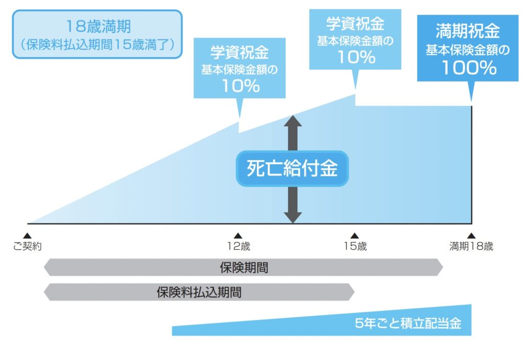 払込期間は3種類(12歳、15歳、18歳)から選択でき、18歳満期と22歳満期で祝金と満期祝金を受け取り方が違います。