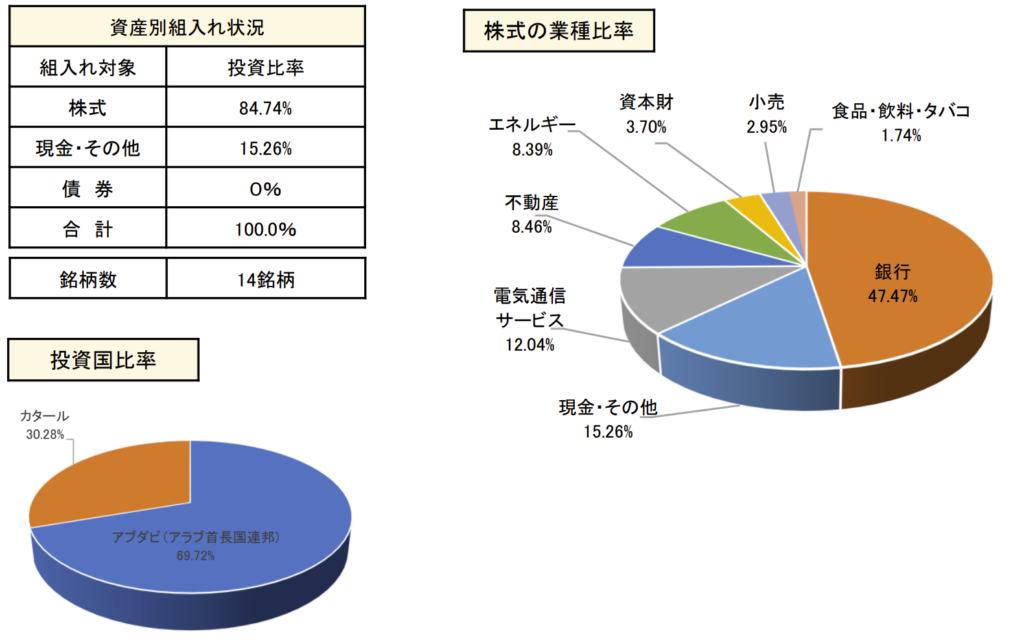 カタール、アブダビの上場企業に投資するファンドです。カタール、アブダビどちらもエネルギーに依存している産業構造を変えようとそれ以外の産業にも積極的に投資をしています。
