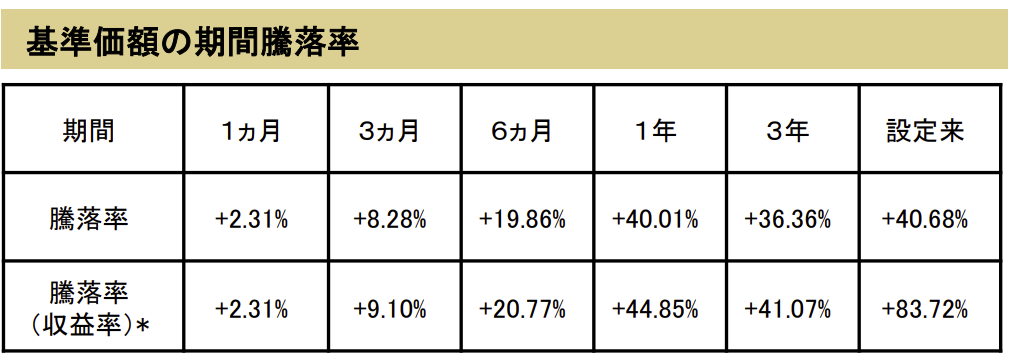 この1年では+40.01%、3年では+36.36%のプラスになります。またこちらのファンドは分配金が出る場合があります。この分配金は出る、出ない、金額もかなりブレがあるので、当てにしないほうが良いでしょう。参考までに、直近1年では1万口あたり合計400円出ています。