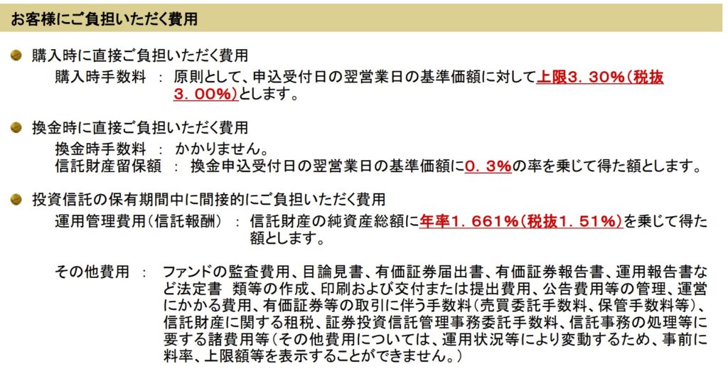 購入する際には3.3%の購入手数料、毎年の管理費用は1.661%、その他手数料は毎回変わります。また珍しく、換金時にも0.3%の費用がかかります。