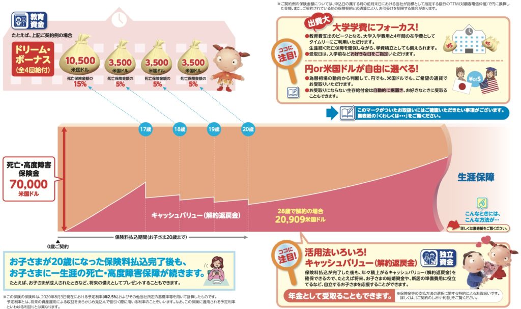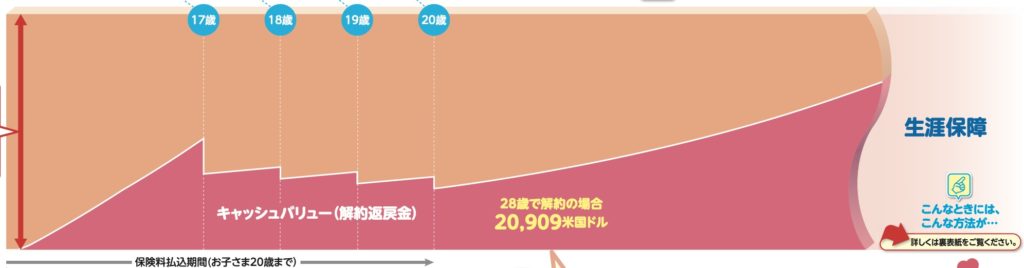 米ドル建の終身保険に生存給付金を受け取れる機能が付いているのがこの商品です。保険料の払込期間は被保険者(子)が20歳までで、給付金を受け取るタイミングはお子さんが17歳、18歳、19歳、20歳です。給付金を受け取った後も終身保険の保障はそのままなのでお子さん自身の一生涯の保障として利用できますし、解約して解約返戻金を受け取ることもできます。