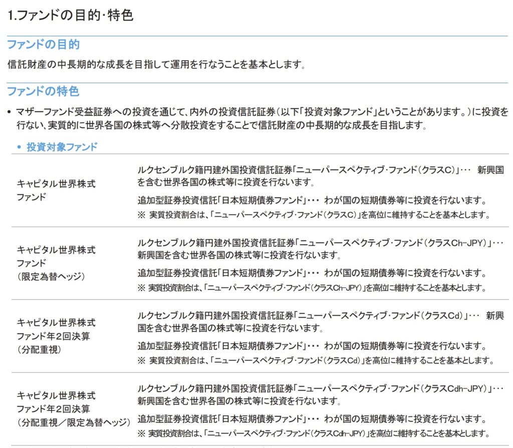 よく覚えていましたね。その通りです。「キャピタル世界株式ファンド」という箱の中で4本のファンドの中からどれにどのくらい投資するか選択できるということですね。その中でも今回はキャピタル世界株式ファンドに絞って、投資先、組み入れ銘柄、上昇率などを確認していきましょう。