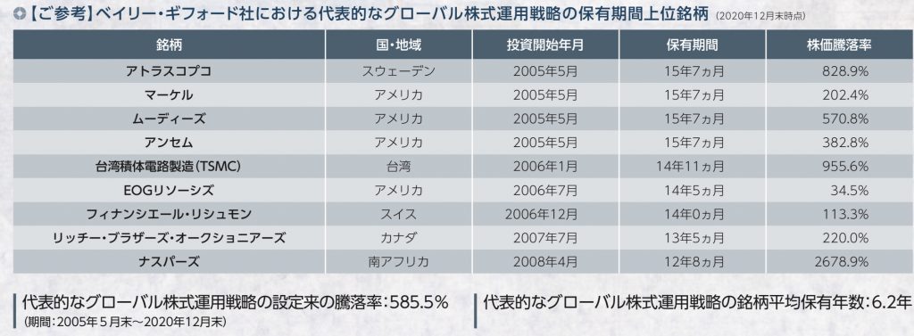 決して新しい銘柄を発掘するだけではなく、既に上昇した後のアルファベット(Google)やアリババのような銘柄が入っているのがわかります。あくまで今後も成長を続けるという判断です。