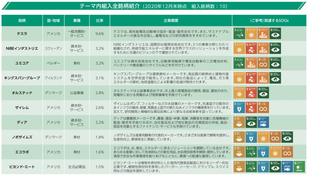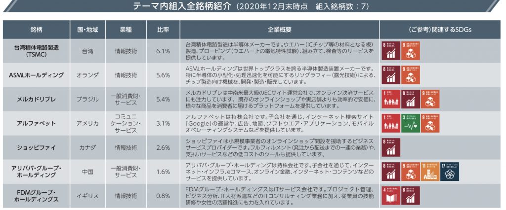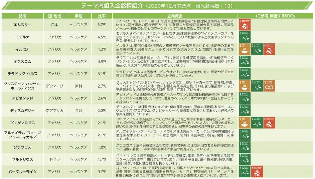 情報技術革新、教育、イノベーションなど将来へのテーマがハッキリしている投資先を選びます。社会的課題から投資先を選ぶのは最近欧米発信で日本でも流行になっているSDGsそのままですね。こちら具体的な投資先銘柄です。