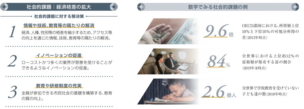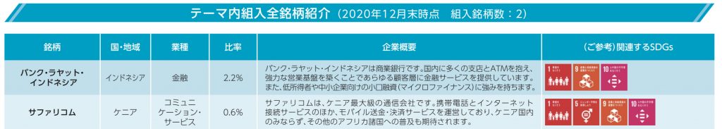 新興国の貧困層に金融、水、教育、医療などのインフラを向上させるのが目的です。新興国の銘柄なので私もほとんど知りませんが、インドネシア、ケニアの銘柄が入ってます。