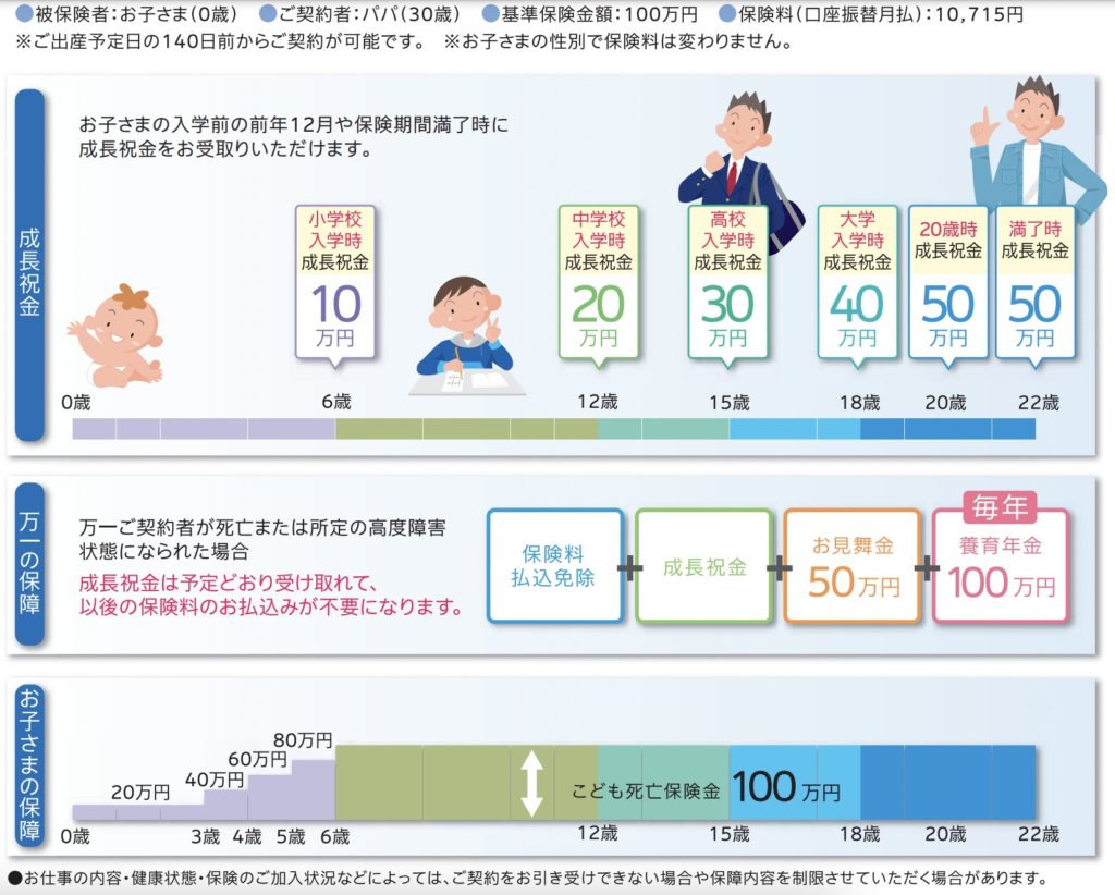 - 契約者(親)が死亡や高度障害になったときは、お見舞金(基準保険金額の50%)が受け取れます。そして以後の保険料の支払いが免除されますが、祝金は通常通り受け取れます。さらに、養育年金(基準保険金額の100%)が保険期間満了まで受け取れます。