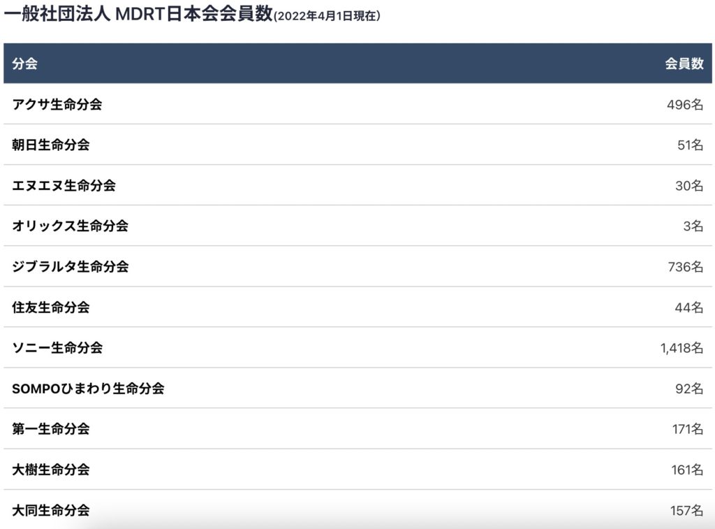 一定の基準をクリアした世界中の保険募集人のことです。日本のMDRT会員数は2022年4月1日時点で7,947人が登録しています。