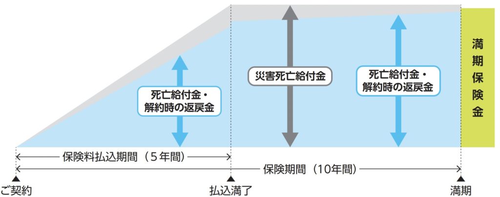 - 病気での死亡は「払った保険料全額」、事故や災害での死亡は「払った保険料全額×1.1倍」が死亡保険金として受け取れる