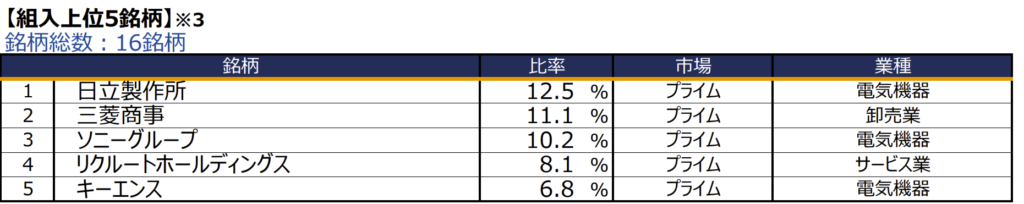 会社数は少ないですがあります。ただし大型株が主なので値動きは良くも悪くも日経平均に連動する可能性が高いです。次で組み入れ銘柄を見ていきましょう。