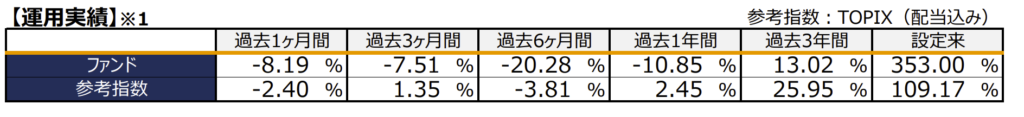 この1年では-10.85%、3年で+13.02%のプラスになります。(参考指数はTOPIX)