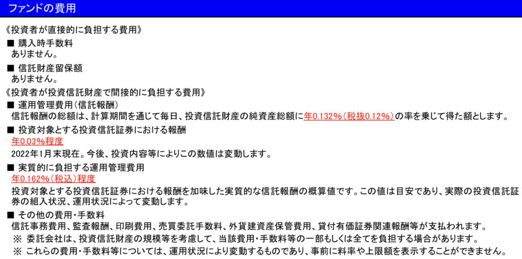 購入手数料も解約手数料(信託財産留保額)もなく、信託報酬が年0.132%とその他で年0.162%だけかかるので、コストが低くていいですよね。