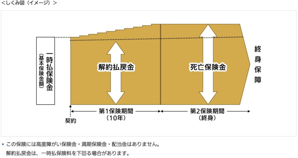 告知の必要がない一時払の円建終身保険です。第1保険期間と第2保険期間の保障内容は同じですが、第1保険期間中は死亡保障額が少しずつ増えていきます。11年目以降は第2保険期間となり死亡保障額は固定されます。死亡保障額の増え方は年齢によって変わります。