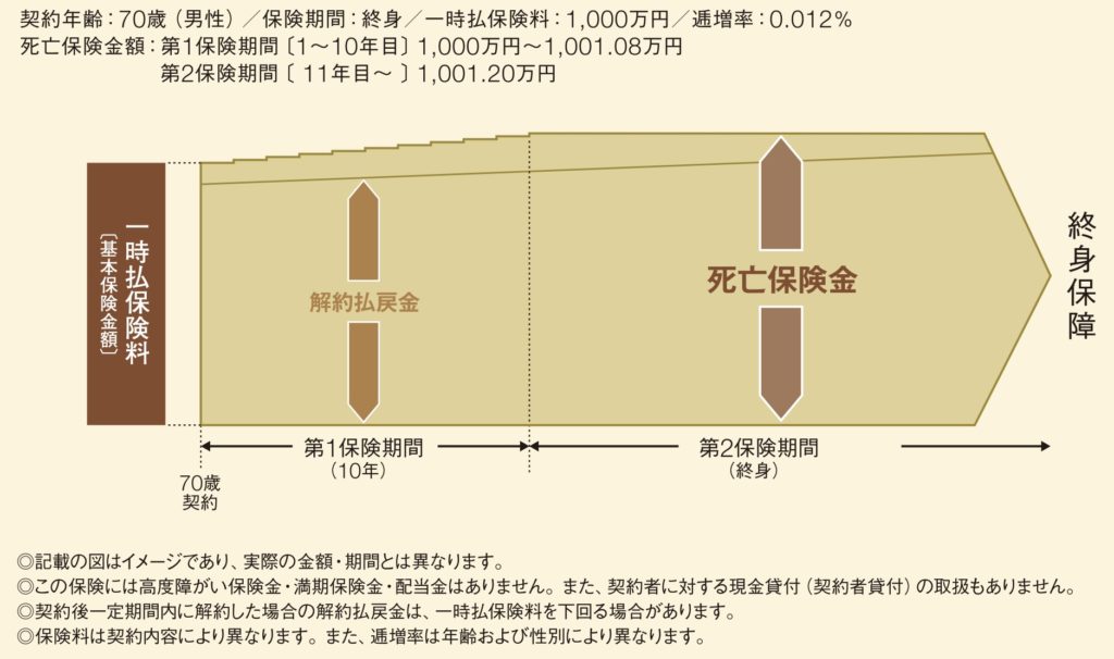 男性70歳の場合は逓増率が0.012%なので、第1保険期間中は毎年この逓増率で死亡保険金が増えて行きます。11年目以降は1,000万円の0.12%つまり1.2万円増えた死亡保障が一生涯継続します。解約をすると解約返戻金が受け取れますが、70歳契約の場合はずっと元本割れだと思います(パンフレットに記載がないので推測ですが)。