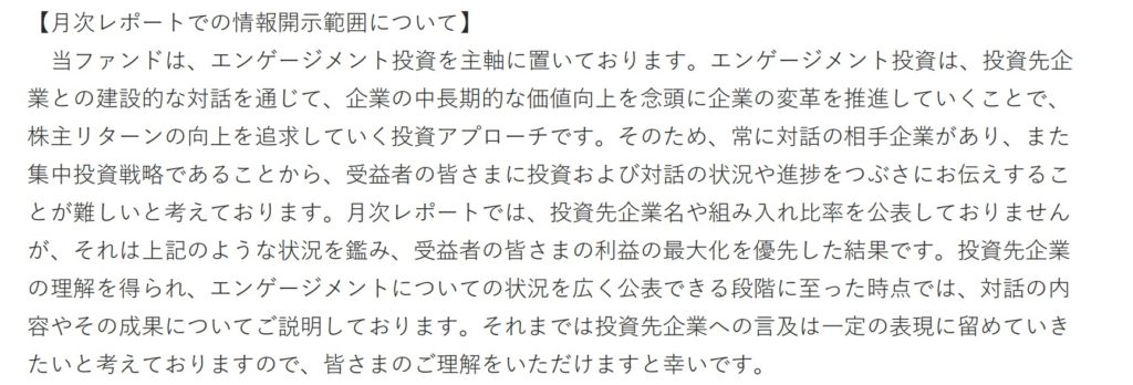 具体的な投資先については非開示となります。理由についてはレポートからその理由がわかります。