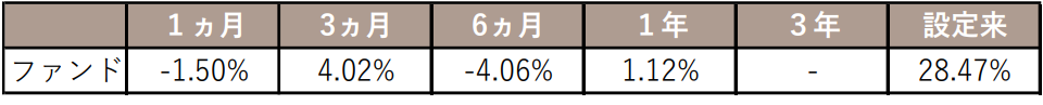 まだ設定されて2年経過していませんが、直近1年で+1.12%、設定来+28.47%のプラスになります。