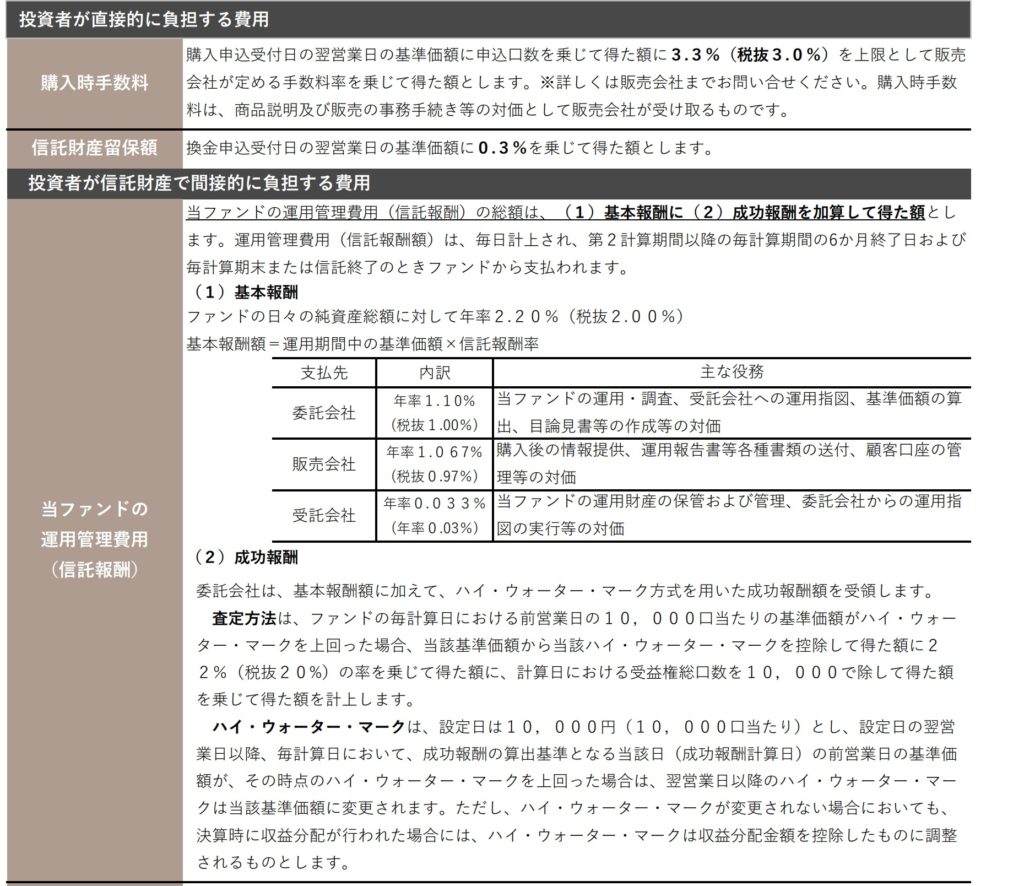 購入時手数料3.3%、毎年の管理費用は年2.2%程度かかります。またアクティビストファンドらしい要素ですが成功報酬があります。基準価額が最高値を上回った場合、上回った基準価額に対して口数に応じた22%が手数料に追加されます。(ハイウォーター・マーク方式)