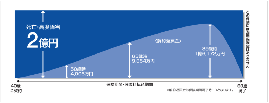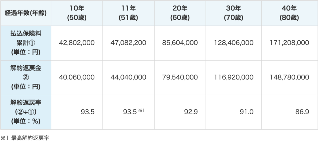 - 40歳男性の場合、11年目あたりが解約返戻率のピーク