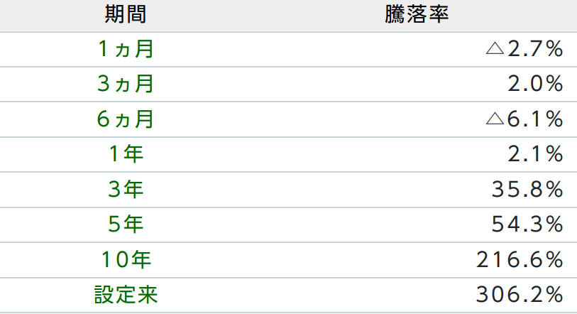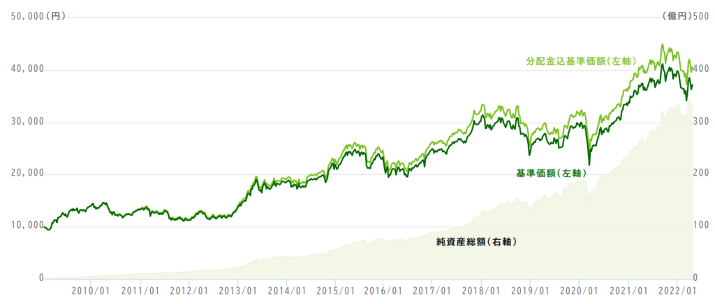この1年では+2.1%、3年で+35.8%のプラスになります。またこちらのファンドは分配金が出る場合があります。出ていない年もありますので当てにしないほうがしないほうがよいでしょう。参考までに直近5年での配当実績は3回で、それぞれ1万口当たり250円~300円程度となります。
