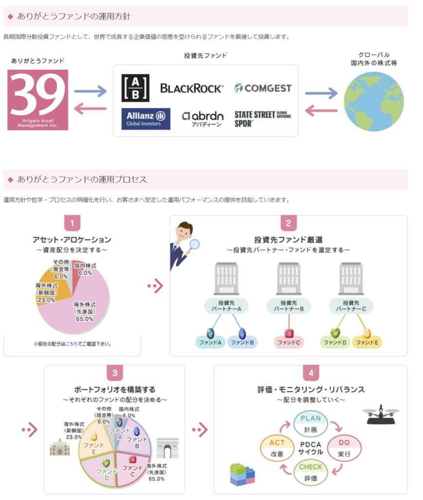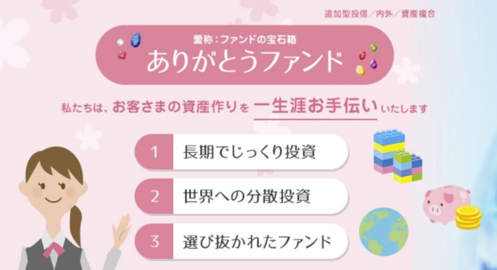社名やファンド名の由来については、「ありがとうございます」をお客さまに、お客さまからは「ありがとう」というお言葉を。というコンセプトを掲げています。ユーザー側は基準価額が上昇してありがとう、ファンド側は購入してくれてありがとうという事ですね。運用方針、組入銘柄など解説していきますので一緒に勉強しましょう。