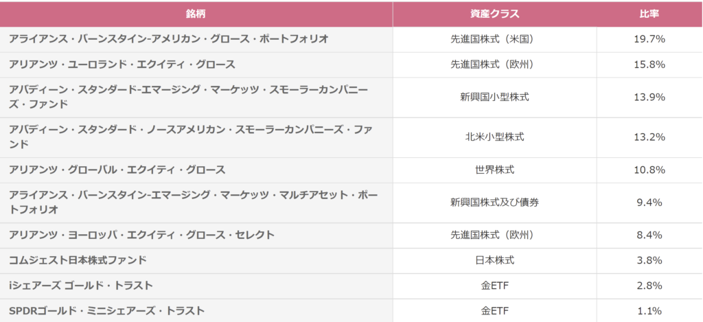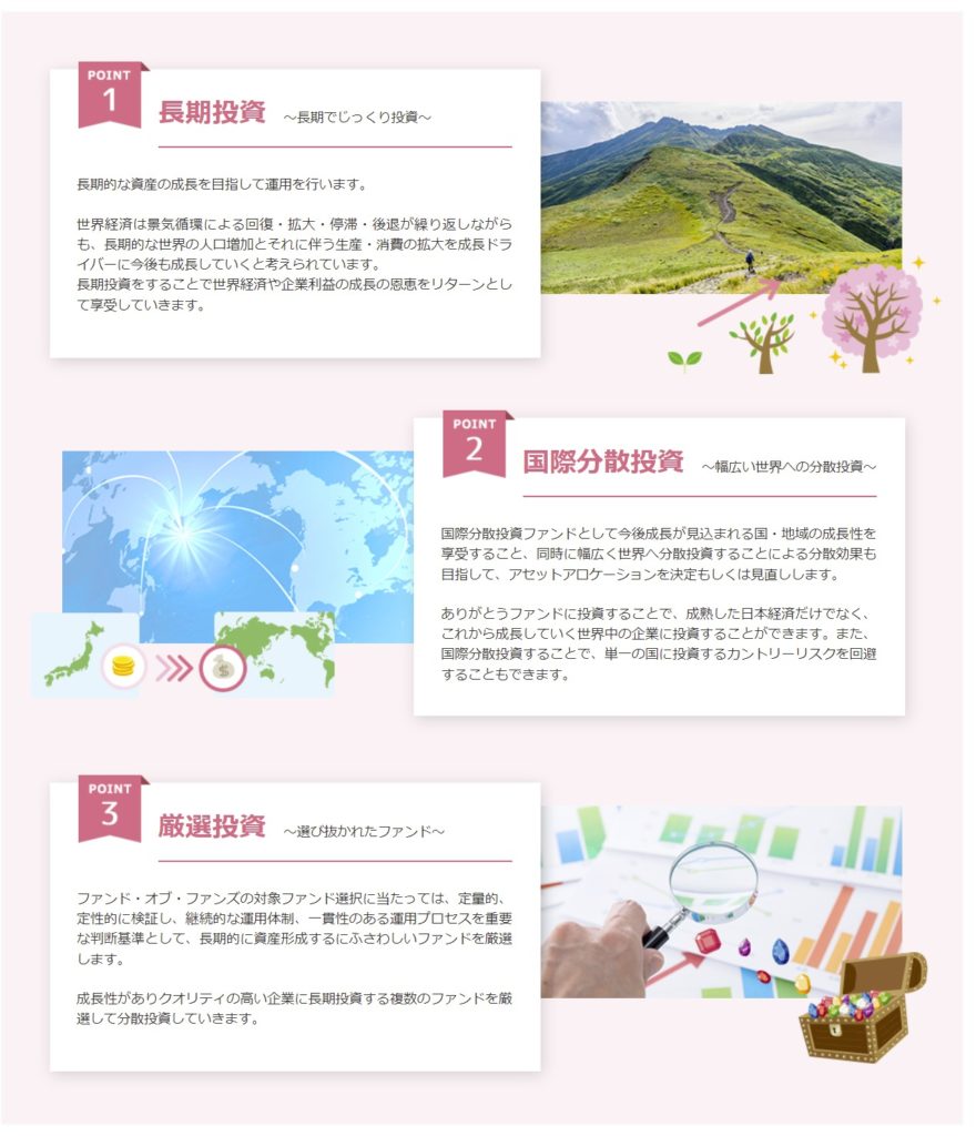 長期国際分散投資を、ファンド・オブ・ファンズの形式で行っていくファンドです。S&P500や全世界株だけを積立していくのはちょっと怖いという初心者向けなファンドですね。