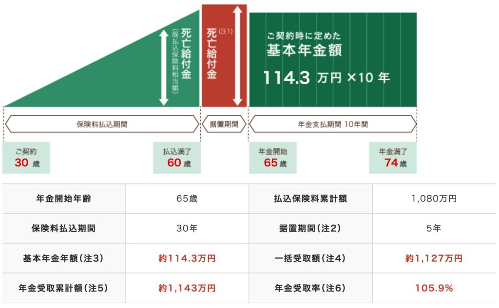 基本年金年額:20万円〜3,000万円(5年確定年金)、10万円〜3,000万円(10年確定年金)