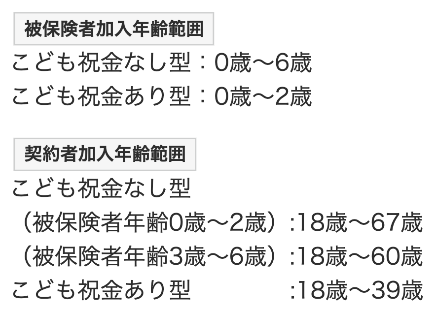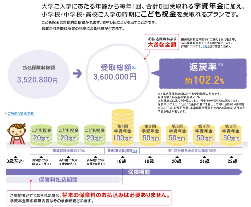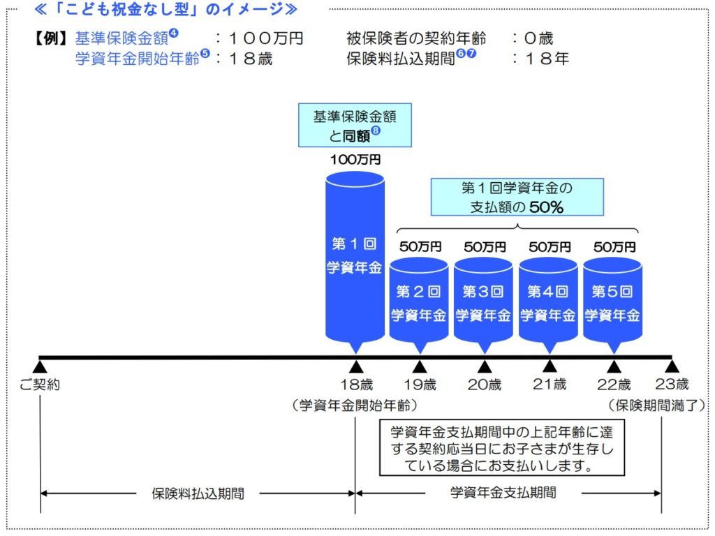 プランが2種類(こども祝金の有無)あり、保険料の払込期間は4種類(5年、10年、17歳、18歳)が選択できます。