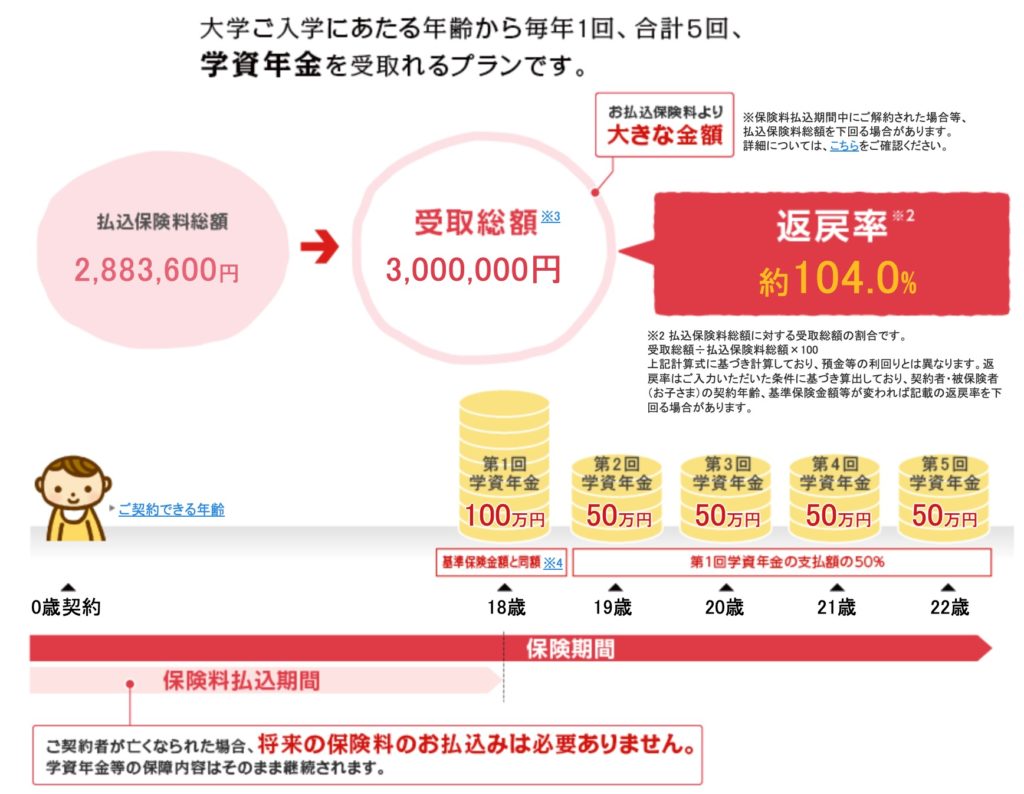 • 契約者(親)が死亡したときは、保険料の支払いが免除されますが、学資年金はそのまま受け取れます。