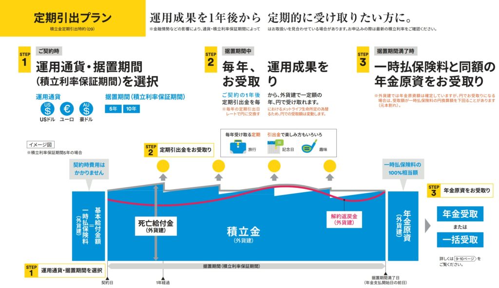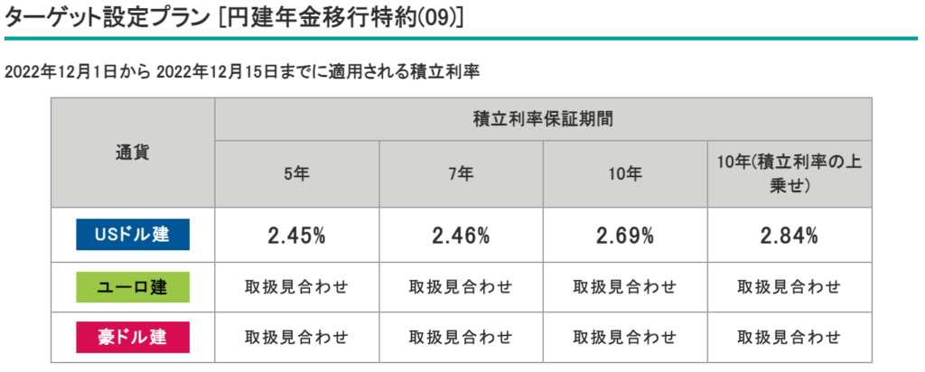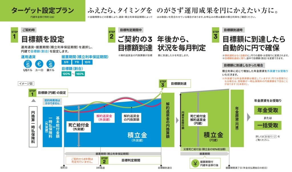 基本プランは複利運用ができ、定期引出プランは金利を毎年受け取っていく単利運用になります。ターゲット設定プランは据置期間中に予め決めた円建の目標値に到達すると自動的に円建の年金資産に移行するプランです。