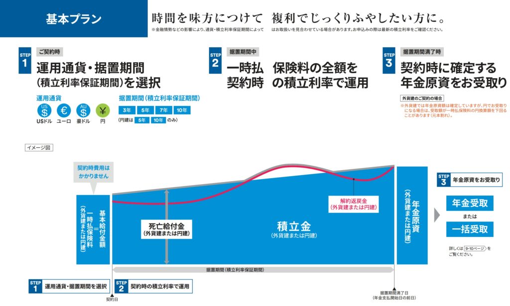 一時払の米ドル建個人年金保険です。契約時に保険料を一括で支払い、据置期間を選択し、据置期間に応じた積立利率が適用されます。積立利率は毎月2回(1日と16日に)更新され、契約成立時の積立利率が据置期間中に固定で適用されます。据置期間が終わると満期を迎えて、満期金を一括で受け取るか、年金として受け取れます。貯蓄を目的として加入する商品です。告知が必要ないので誰でも申し込みできますが、一時払で入金した金額と死亡保険金額が同じで上乗せがないからです。あとは寝かしておくと積立利率に応じて増えていくイメージです。