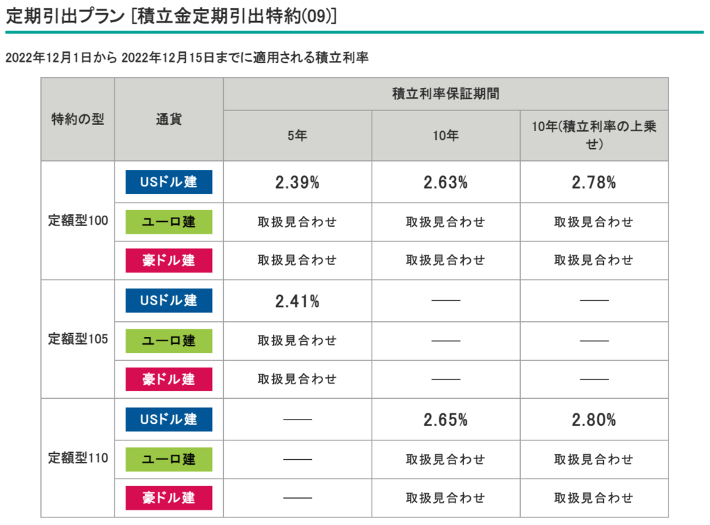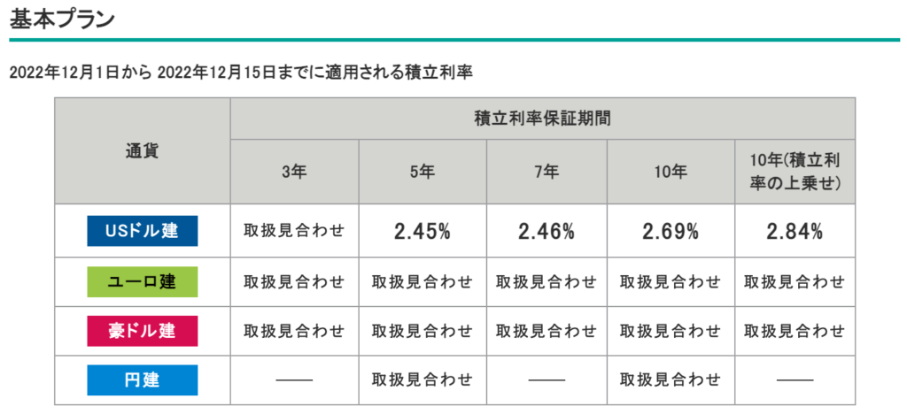 プランの種類と現在(2022年12月1日〜12月15日)の積立利率