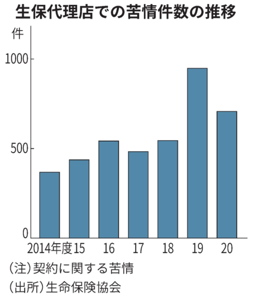 現在、保険代理店は生命保険で約8万、損害保険では約16万あります。保険各社にとって代理店は主要な販売チャネルの1つであることには変わりない。しかしながら、代理店による保険販売を巡る苦情件数は近年高止まりしている。上記のグラフにあるように、生命保険協会によると生保代理店での契約に関する苦情は2019年度に過去最多の948件。新型コロナウイルス禍の20年度も700件ほどと高い水準だった。