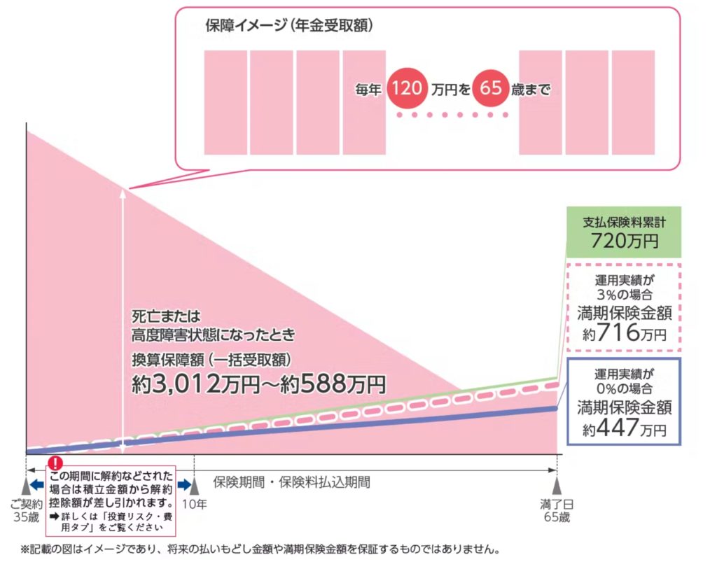 3%リターンでは元本割れになってしまいます。同じように毎月20,000円を30年間積立して年間3%で運用できたら、1,165万円になります。それだけコストが掛かっているということです。死亡保障は子どもが自立するまでの期間だけあればいいので、保険料の安い収入保障保険で備えて、貯蓄は別で行いましょう。