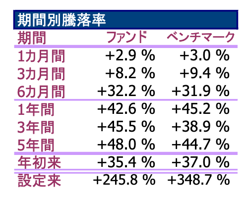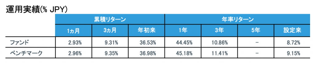 パフォーマンスを比較すると、こちらもベンチマークは下回っております(同じく為替の影響)が、