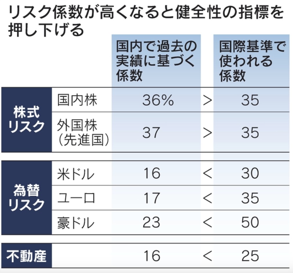 国際基準であるICSを適用すると、アリアンツ(ドイツ)やアクサ(フランス)といった世界的な保険会社と同一の規制になる。係数が大きいほどリスクが膨らむため、資本を積み増したり、再保険の活用でリスクを減らしたりする必要が出てくる。たとえば不動産のリスク係数は国際基準が25%なのに対し、過去20年の実績は16%だった。