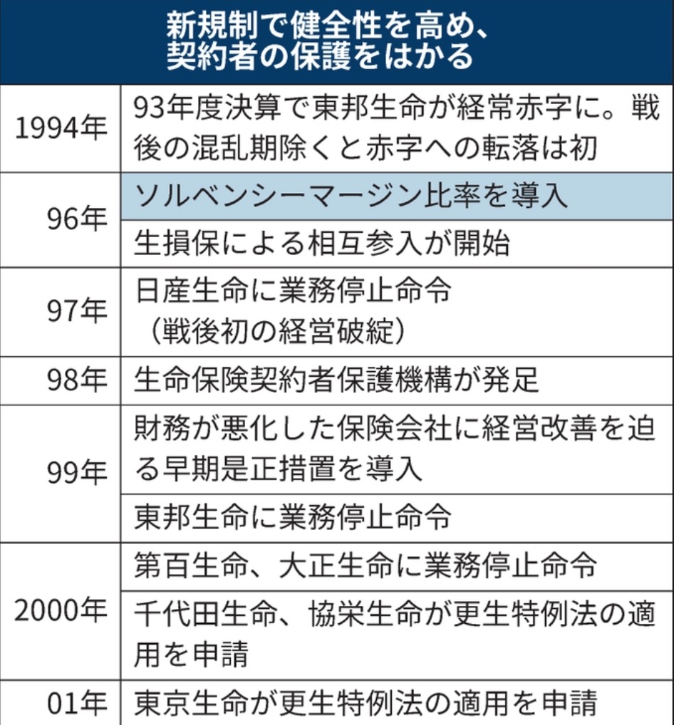 しかしながら、現行の規制では金利変動の影響を必ずしも正確に反映できていないとして2025年に国内の保険会社に新たな資本規制を適用するに至りました。財務状況の透明性を高めるのが目的で、29年ぶりの見直しとなる。保険契約を時価で評価し、保険金の支払い能力を正確に見極められるようにする。簿価を使う現状の規制では、市場動向の影響を織り込みにくかった。終身保険など保障期間が長い商品の販売を抑えるなどの影響も出そうだ。