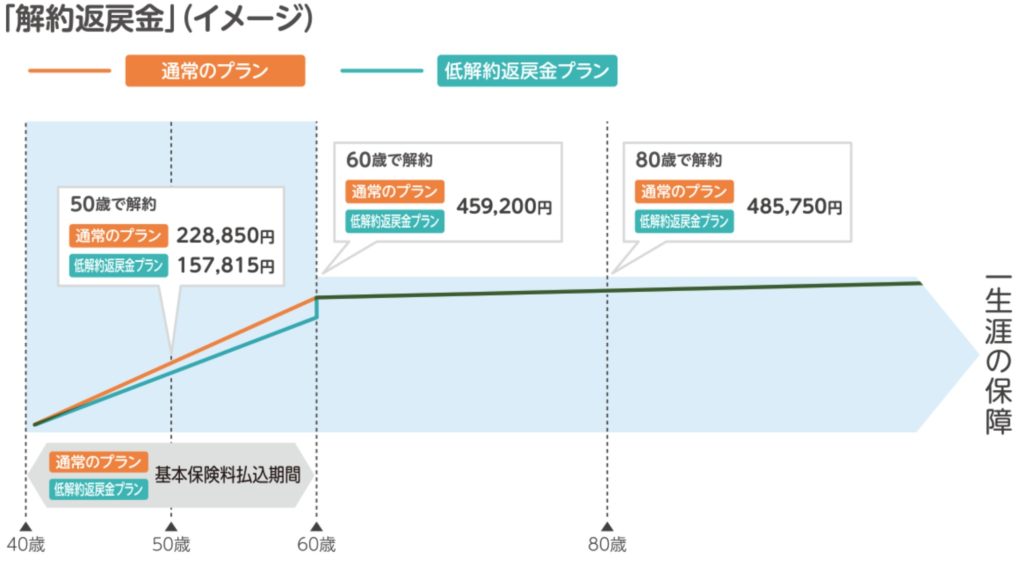 普通の終身保険です。保険料払込期間が終わると保障額が半分になります。解約返戻金のタイプは、通常プラン低解約返戻金プランを選択できます。