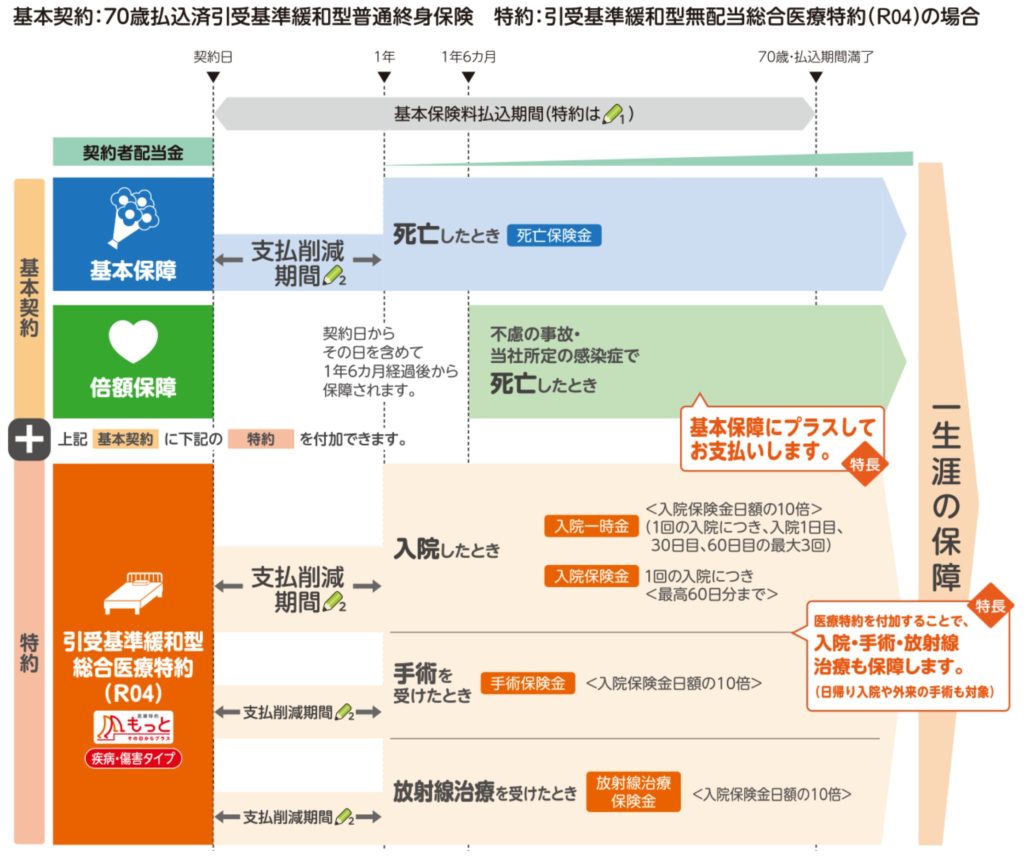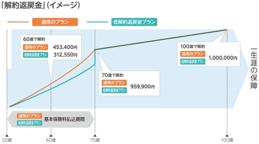 引受基準緩和型の終身保険というイメージです。契約日から1年間は保障内容が半分になり、2年目からは通常通りの保障内容になります。解約返戻金のタイプは、通常プランか低解約返戻金プランを選択できます。引受基準緩和型は通常よりも保険料が割高になります。