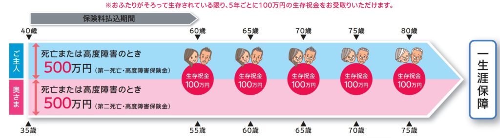 保険料払込終了してから5年ごとにお二人がそろって生存している限り、生存祝金として基本保険金額の10%を受け取れます。