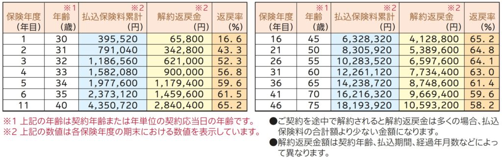 上記の通り、解約返戻率が100%を超えることはありません。ピークが40歳〜45歳で65.2%、その後は低下していきます。長生きをすれば保険料を支払い続けるので81歳の時点で基準保険金額2,000万円以上を支払うことになります。