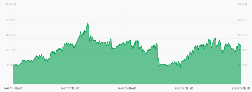 スタートを100としての数字になります。上がり下がりをしながら現在(2022年8月31日)は157.9となっています。販売されて直ぐに契約した人は年利9%くらいになります。現在のユニットプライス157.9を基準に考えると、この数字より高いタイミングで契約した人はマイナスリターンであり、低い時に契約した人はプラスリターンということ。ざっくりの計算になりますが、