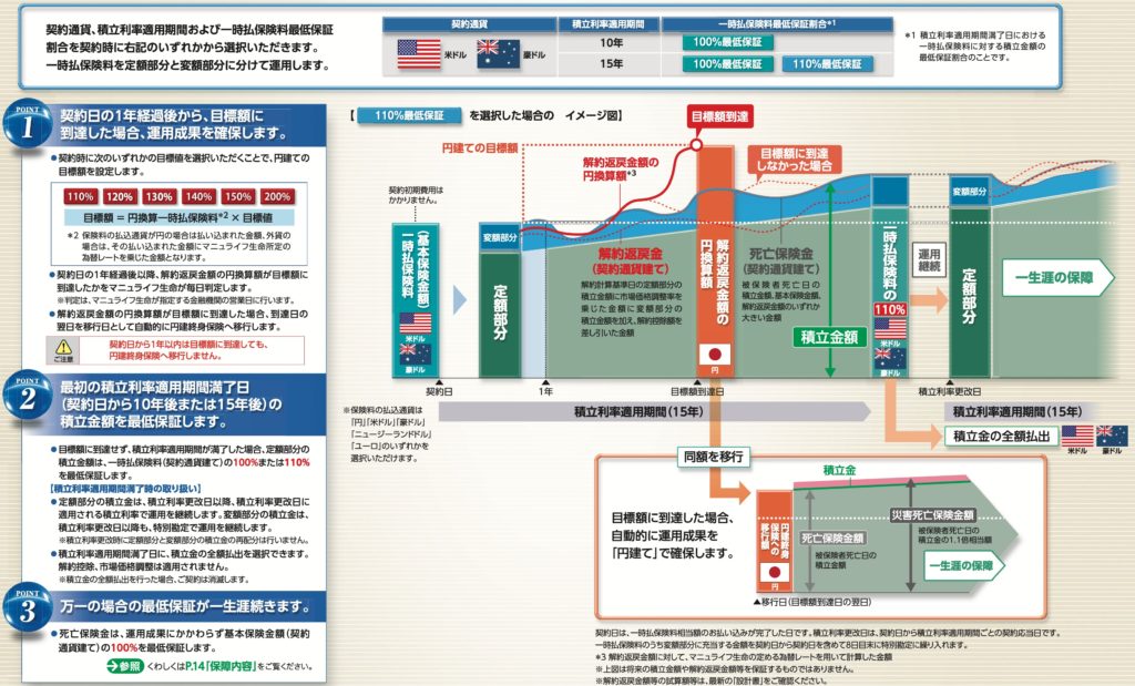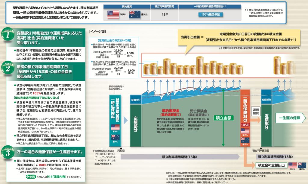 - 定額部分(最低保証)と変額部分(運用次第)がある一時払外貨建保険