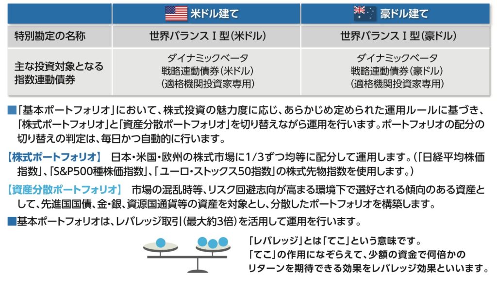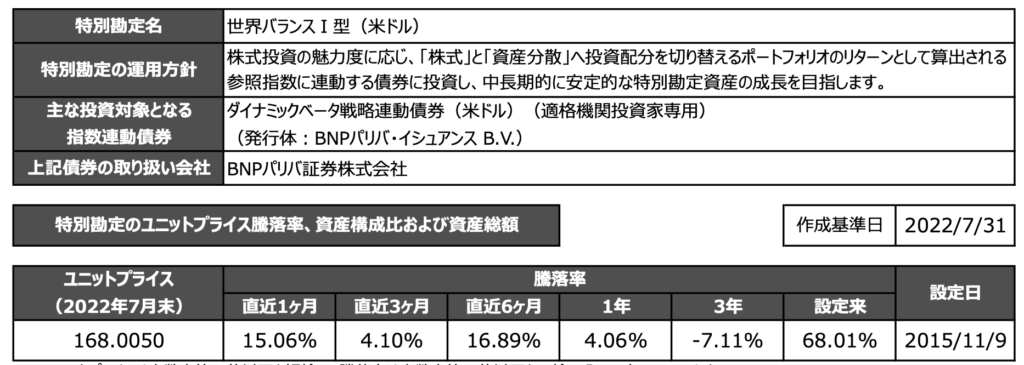簡単に言うと「相場状況に応じて債券と株式の比率を変えて運用します」ということです。つまり世界バランスⅠ型を発行しているBNPパリバにお任せってことです。